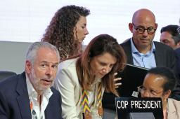 COP30の会合で協議するコレアドラゴ議長(手前左)ら=22日、ブラジル・ベレン(共同)