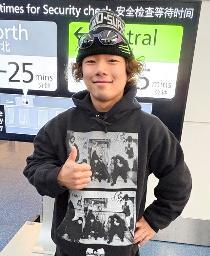 W杯開幕戦を前に羽田空港で取材に応じるスノーボード男子の長谷川帝勝=24日