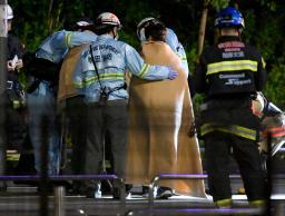 閉じ込められた観覧車から救助され、消防隊員に毛布をかけられる乗客=26日午前2時42分、大阪府吹田市