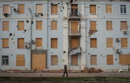 ロシアの攻撃が続く中で損傷した建物=26日、ウクライナ東部ドネツク州クラマトルスク(ロイター=共同)