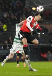 セルティック戦の後半、競り合うフェイエノールトの上田(手前)=ロッテルダム(共同)