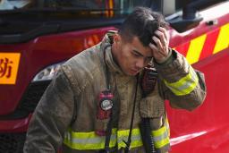 消火活動が続く高層住宅の火災現場で頭に手をやる消防士=28日、香港北部・新界地区大埔(共同)