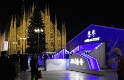 ミラノの大聖堂前広場にオープンしたミラノ・コルティナ五輪・パラリンピックのメガストア=28日(共同)