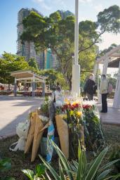 大規模火災が起きた香港北部の高層住宅群近くに手向けられた花束=29日(共同)