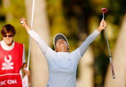 最終日、プレーオフを制して優勝を決め、喜ぶ鈴木愛=宮崎CC