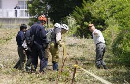 北海道福島町で、ヒグマに襲われた男性が倒れていた現場付近を調べる町役場職員ら=7月