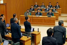 福井県議会本会議で杉本達治知事(奥前列右)の辞職に全会一致で同意する議員=4日午前