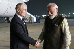 4日、インド・ニューデリーに到着したロシアのプーチン大統領(左)を出迎えるモディ首相(タス=共同)