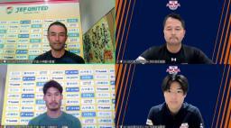 J1昇格プレーオフに向けオンラインで記者会見する千葉の小林監督(左上)鈴木大(同下)、大宮の宮沢監督(右上)、市原=5日