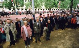 上皇ご夫妻(当時天皇、皇后両陛下)のパレードに背を向けて沿道に並ぶ元旧日本軍捕虜ら=1998年5月、ロンドン(共同)