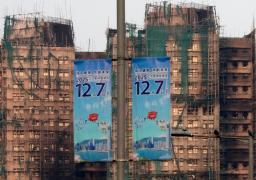 火災のあった高層住宅群(奥)の近くに掲げられた立法会選挙の投票を呼びかけるポスター=5日、香港(共同)