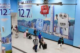 駅構内の壁一面に張られた立法会選挙の投票を呼びかける広告=6日、香港(共同)