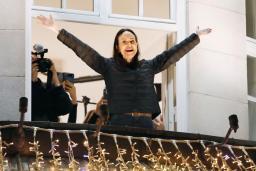 オスロに到着し、ホテルのバルコニーで両手を広げるノーベル平和賞を受賞したベネズエラの野党指導者マリア・コリナ・マチャド氏=11日(共同)