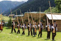 スイス・ダボスで、ヨーデルのイベントに参加するアルペンホルンのグループ=2014年7月(Arno Balzarini/Keystone提供・AP=共同)