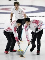 男子プレーオフ 中国戦の第6エンド、スイープする柳沢(右)と山本。奥は小泉=ケロウナ(共同)