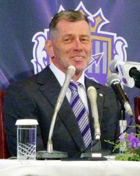退任記者会見するJ1広島のミヒャエル・スキッベ監督=12日、広島市