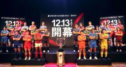 リーグワンの開幕に向けた記者会見でポーズをとる各チームの選手=2日、東京都内