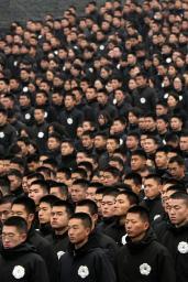 「南京大虐殺記念館」で開催された国家追悼式典の参列者=13日、中国江蘇省南京市(共同)